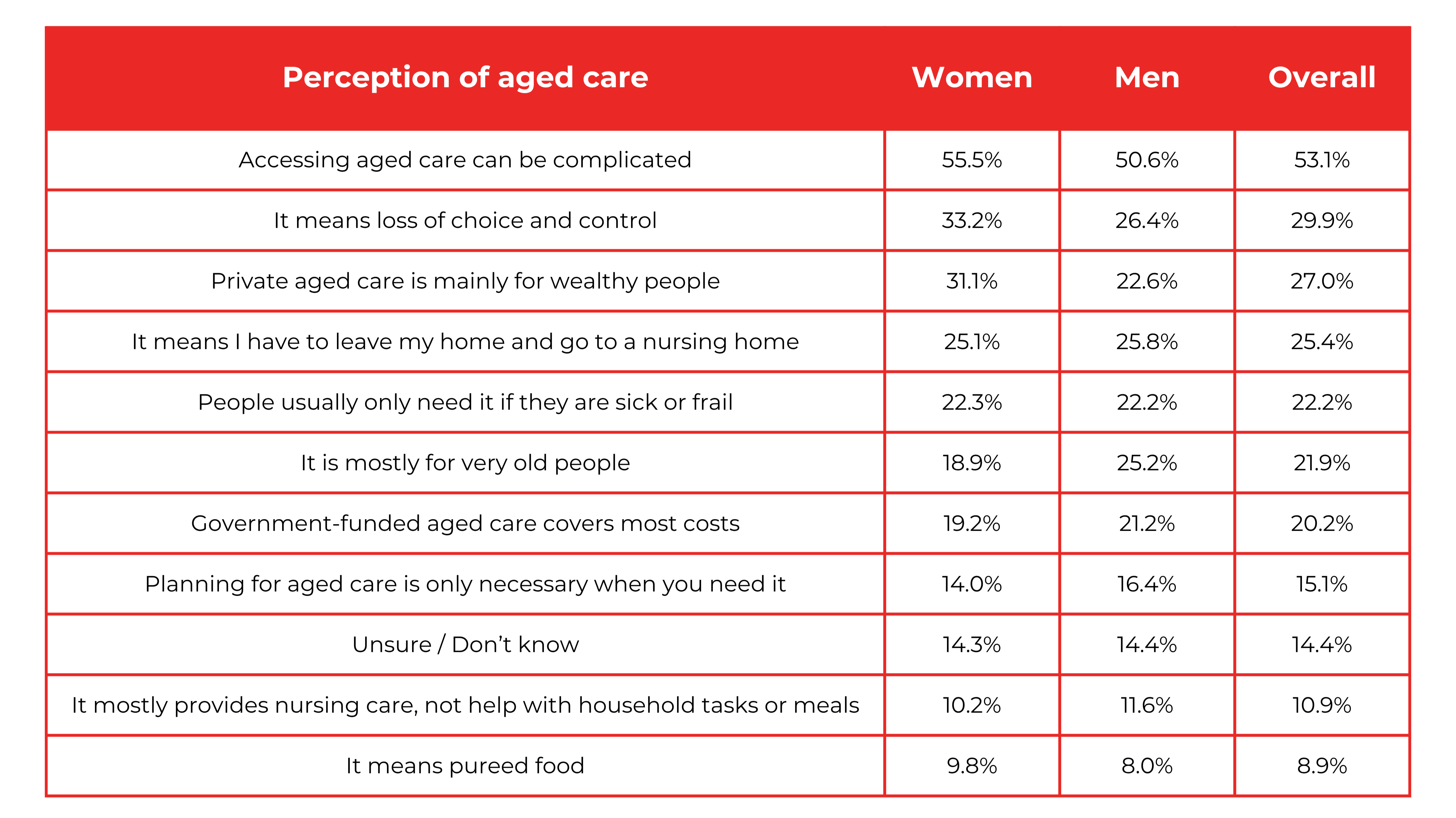 Over half (53.1%) of surveyed Australians felt that accessing aged care can be complicated, with slightly more women than men sharing this view (55.5% vs 50.6%). The second most common perception was that entering aged care means a loss of choice and control (29.9%).
