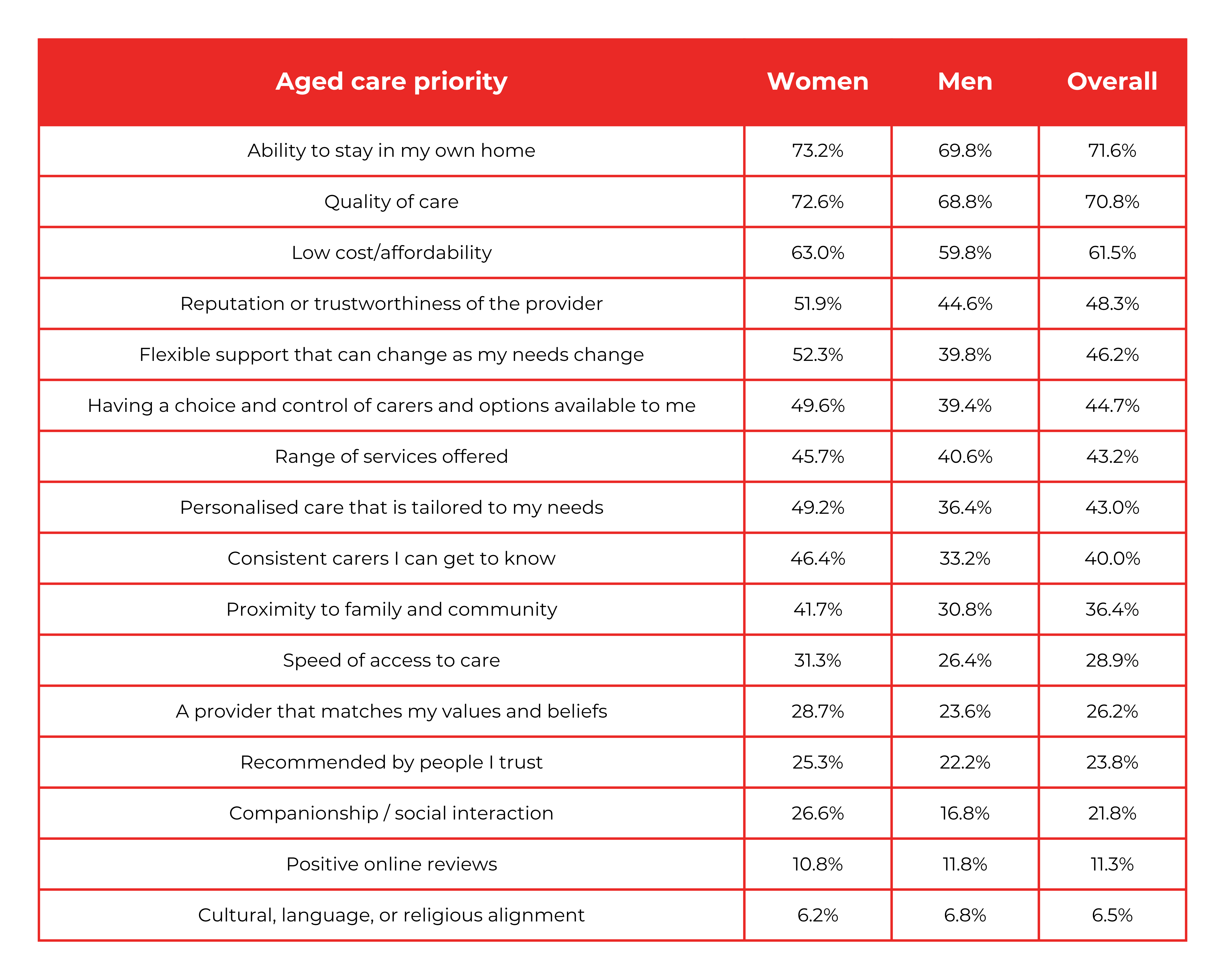When thinking about aged care, the ability to stay in their own home came out on top for older Australians, with 71.6% saying it’s a priority. Quality of care wasn’t far behind, with 70.8% flagging it as important. Affordability also matters, with around three in five people highlighting the cost of care as a key consideration.