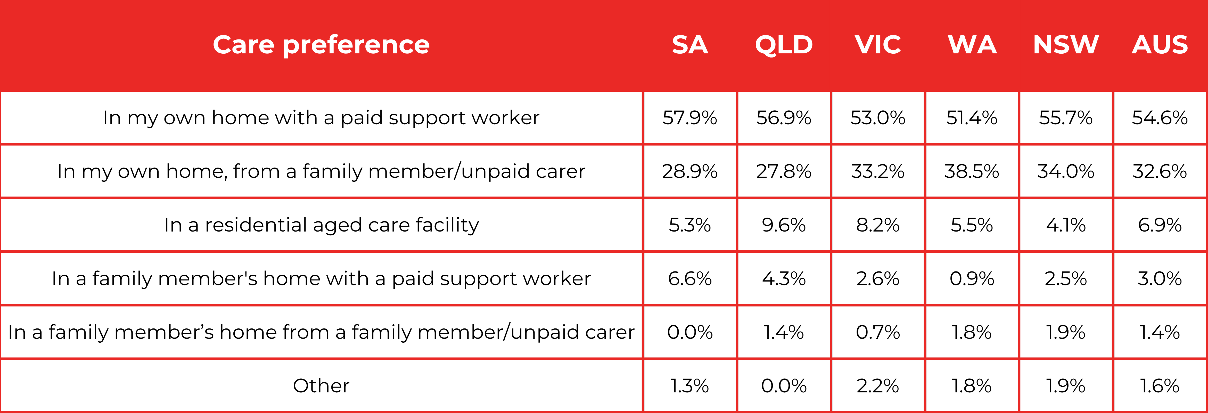Regionally, South Australians were most likely to want to stay at home with a paid support worker, above the national average of 55%, while Western Australians were least likely at 51%. Western Australians also stood out for preferring care from a family member at home (39%), higher than the national average of 33%. Victorians were close to the national average on most options, with 53% wanting care at home with a paid support worker, while Queenslanders were slightly more likely than average to choose residential aged care at 10%. Very few Australians, around 1–3%, wanted to live in a family member’s home, whether with a paid or unpaid carer.
