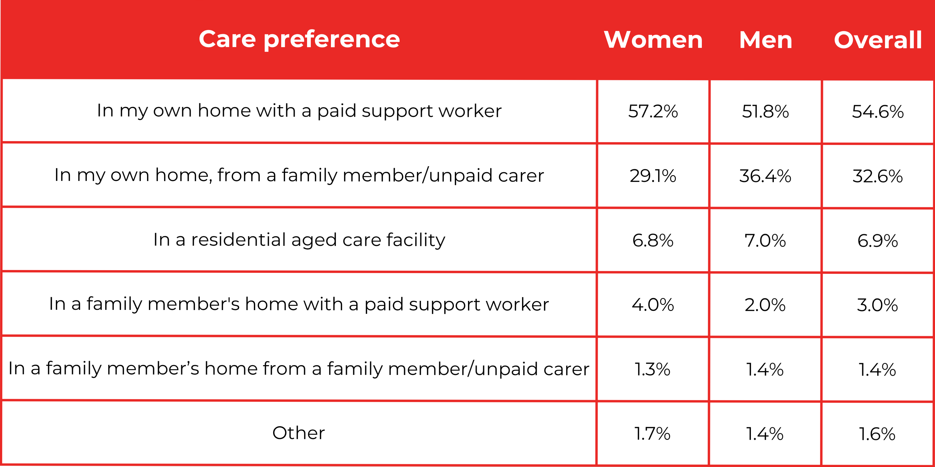 Looking at gender differences, women were more likely than men to prefer care in their own home with a paid support worker (57.2% vs 51.8%), while men were slightly more inclined to receive care from a family member or unpaid carer (36.4% vs 29.1%).