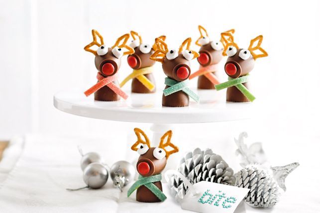Using a sharp knife and colours as a guide, cut sour straps lengthways into thin strips. Wrap 1 strip around neck of reindeer. Secure with a little melted chocolate. Repeat with remaining reindeers. Set aside for 30 minutes or until firm. Serve. 1 M&M to front of head to form a nose. Hold until secure. Using a little melted