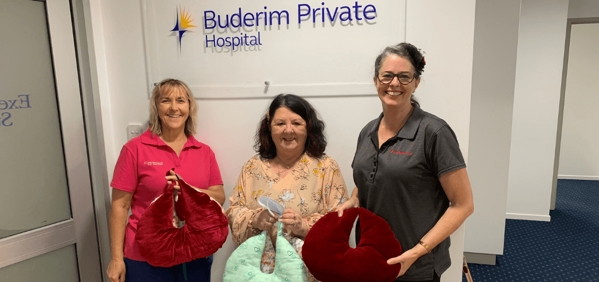 During Lyn’s stay at Buderim Private Hospital, a volunteer handed her a soft, c-shaped cushion which significantly eased the pain after her two breast operations.